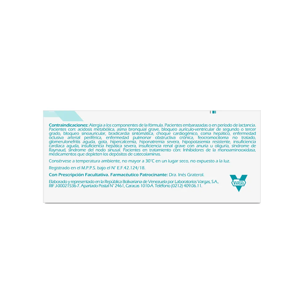 Alergia a los componentes de la fórmula. Pacientes embarazadas o en período de lactancia. Pacientes con: acidosis metabólica, asmabronquial grave, bloqueo aurículo-ventricular de segundo o tercer grado, bloqueo sinoauricular, bradicardia sintomática, choque cardiogénico, coma hepático, enfermedad oclusiva arterial periférica, enfermedad pulmonar obstructiva crónica, feocromocitoma no tratado, glomerulonefritis aguda, gota, hipercalcemia, hiponatremia severa, hipopotasemia resistente, insuficiencia cardíaca aguda, insuficiencia hepática severa, insuficiencia renal grave con anuria u oliguria, síndrome de Raynaud, síndrome del nodo sinusal. Pacientes en tratamiento con: inhibidores de la monoaminooxidasa, medicamentos que depleten los depósitosde catecolaminas