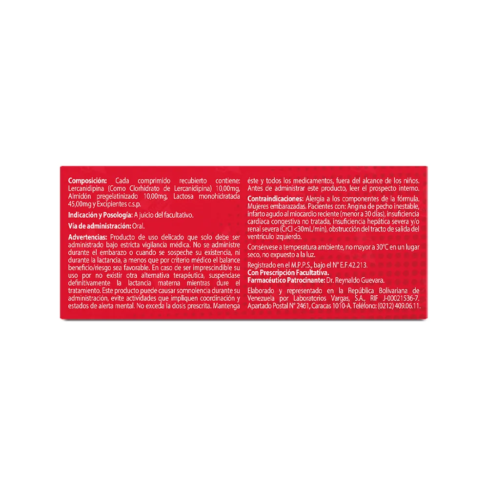 Composición:Cada comprimido recubierto contiene: Lercanidipina (Como Clorhidrato de Lercanidipina) 10,00mg, Almidón pregelatinizado 10,00mg, Lactosa