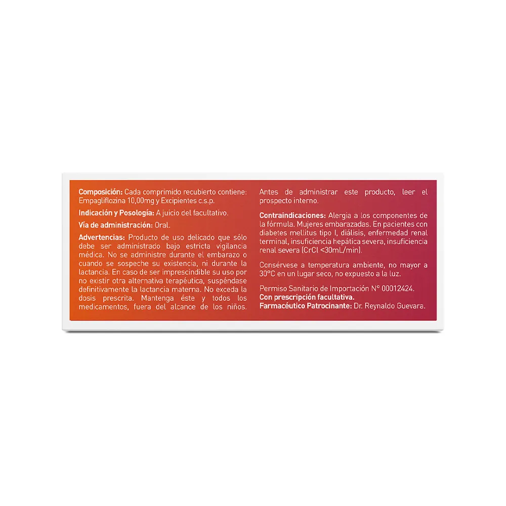 Antes de iniciar el tratamiento con Empagliflozina, se deben considerar los antecedentes clínicos del paciente que puedan predisponer a desarrollar un cuadro de cetoacidosis. Se recomienda verificar los niveles de cuerpos cetónicos en sangre, en comparación con la orina y, en aquellos pacientes en los que se sospeche o se diagnostique un cuadro de cetoacidosis, se debe suspender el tratamiento, independientemente de los niveles de glucosa en sangre. Se recomienda verificar la función renal antes de iniciar el tratamiento con Empagliflozina y, periódicamente, al menos una vez al año, así como antes de iniciar el tratamiento concomitante con cualquier medicamento que pueda tener un impacto negativo en la función renal. Se debe interrumpir el tratamiento con Empagliflozina en aquellos pacientes con absceso perineal, que pueden preceder a fascitis necrosante o gangrena de Fournier, hipovolemia, infecciones complicadas del tracto urinario, así como pacientes que estén o vayan a ser hospitalizados por un procedimiento quirúrgico mayor o enfermedades agudas graves. En pacientes ancianos. En pacientes con antecedentes de abuso de alcohol, baja reserva de células β funcionales (Pacientes con diabetes mellitus autoinmune latente del adulto, diabetes mellitus tipo II con péptido C bajo, pancreatitis), deshidratación grave, enfermedad cardiovascular, enfermedad gastrointestinal, trastornos que den lugar a una ingesta restringida de alimentos. En pacientes en tratamiento con antihipertensivos con antecedentes de hipotensión, diuréticos, dosis de insulina elevadas debido a cirugía o enfermedad médica aguda, dosis de insulina reducida, debido al riesgo de cetoacidosis, inhibidores de la enzima convertidora de angiotensina