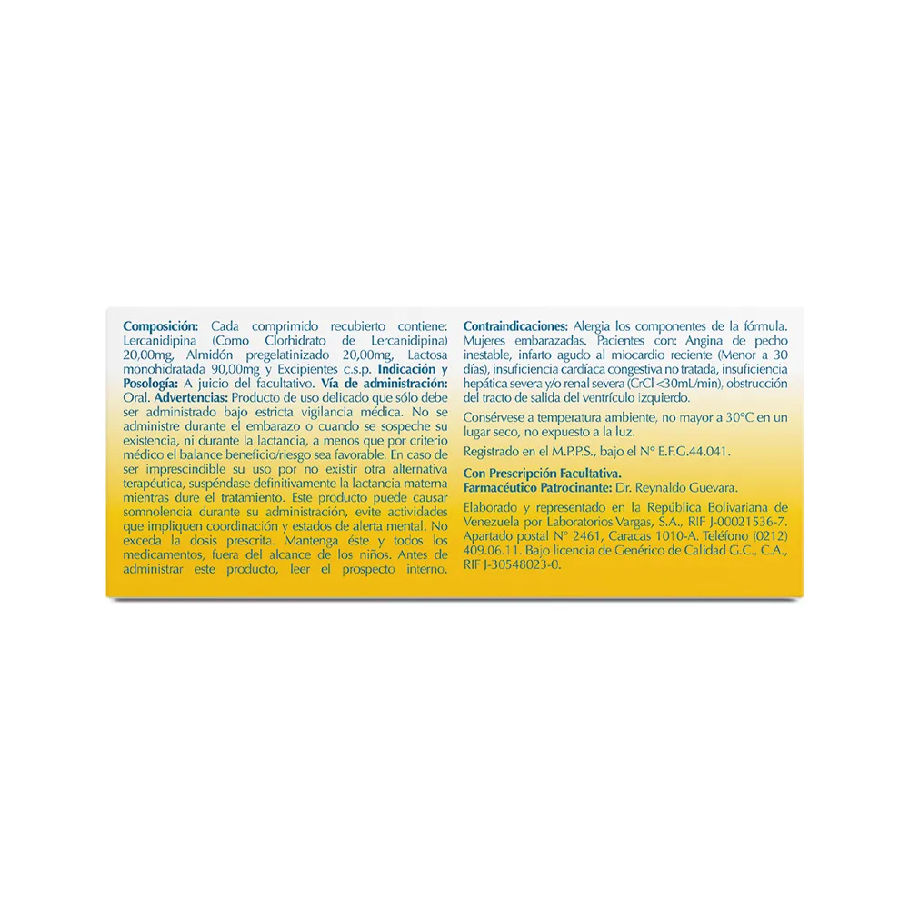 Clorhidrato de Lercanidipino) 20,00mg, Almidón pregelatinizado 20,00mg, Lactosa