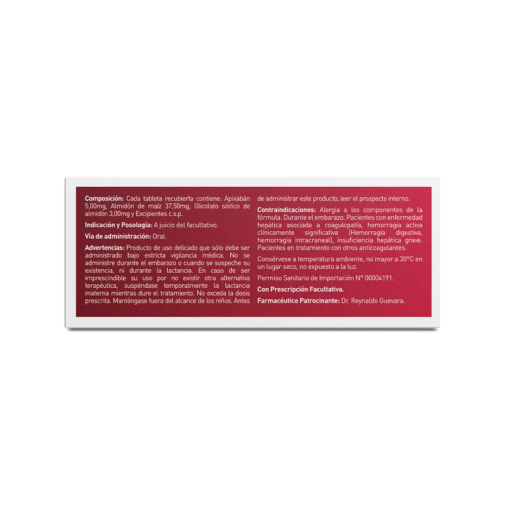 Prevención de la trombosis venosa: En cirugía electiva de reemplazo de cadera o rodilla: 2,5mg, dos veces al día. La dosis inicial debe administrarse de doce a veinticuatro horas después de la cirugía. La duración del tratamiento en pacientes sometidos a reemplazo de cadera es de treinta y dos a treinta y ocho días y, en pacientes sometidos a cirugía de reemplazo de rodilla es de diez a