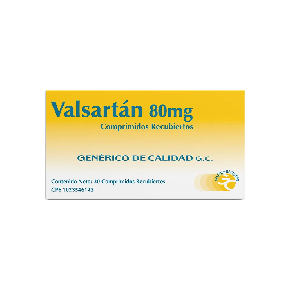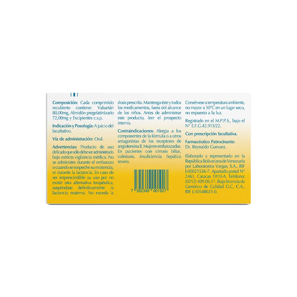 Composición:Cada comprimido recubierto contiene: Valsartán 80,00mg, Almidón pregelatinizado 72,00mg y Excipientes c.s.p.